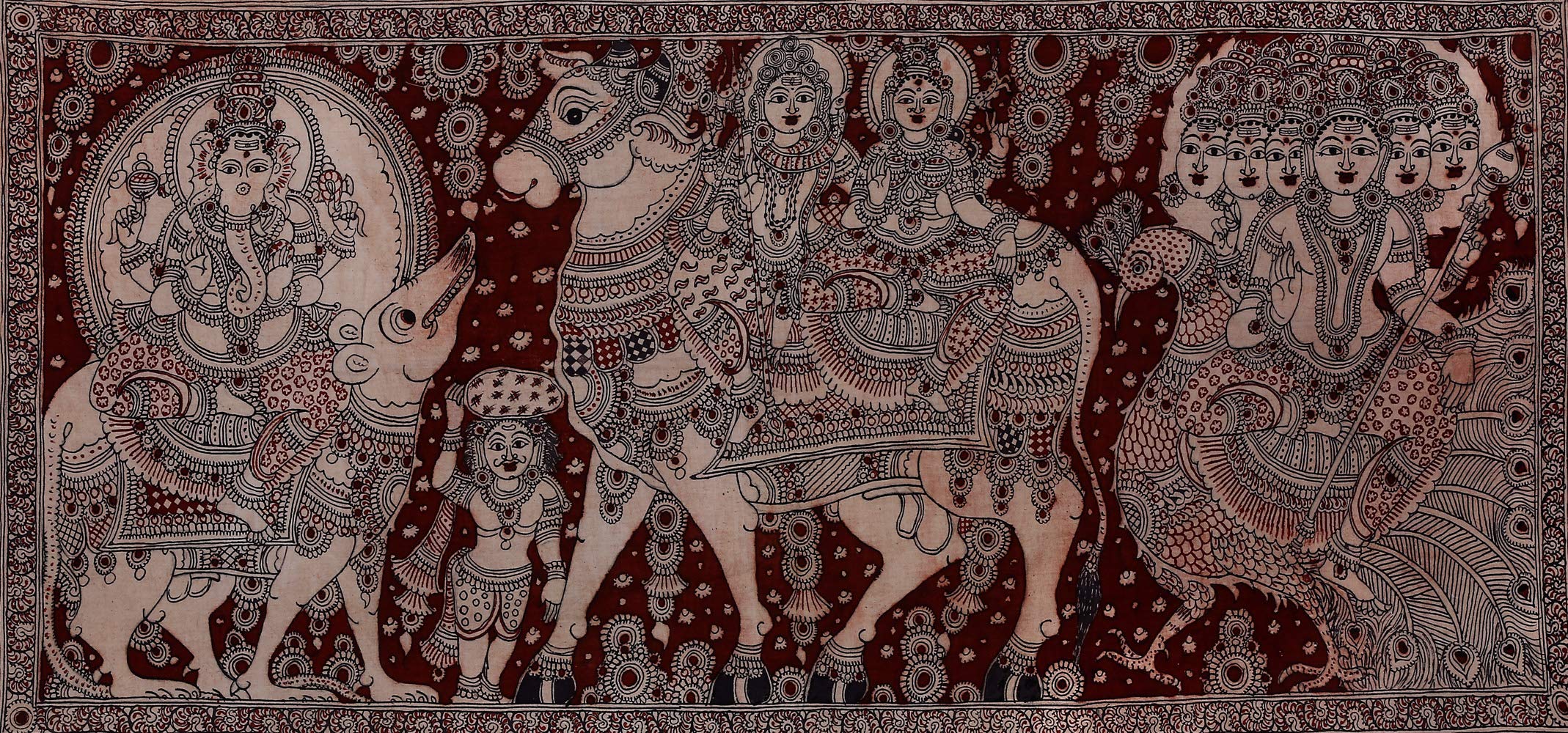 Exotic India Shiva Parivar On Their Respective Vahanas - Kalamkari Painting on Cotton - Artist - D. Lakshmamma (A