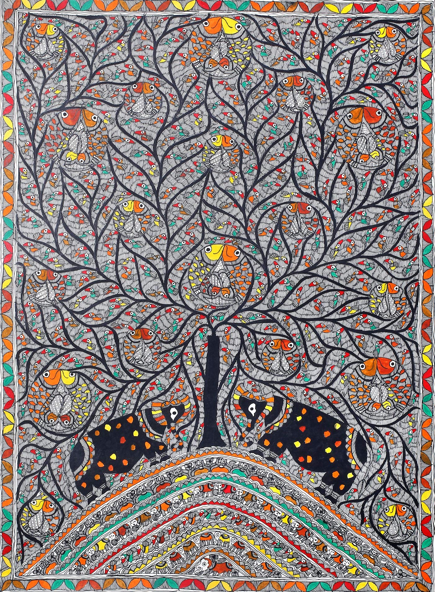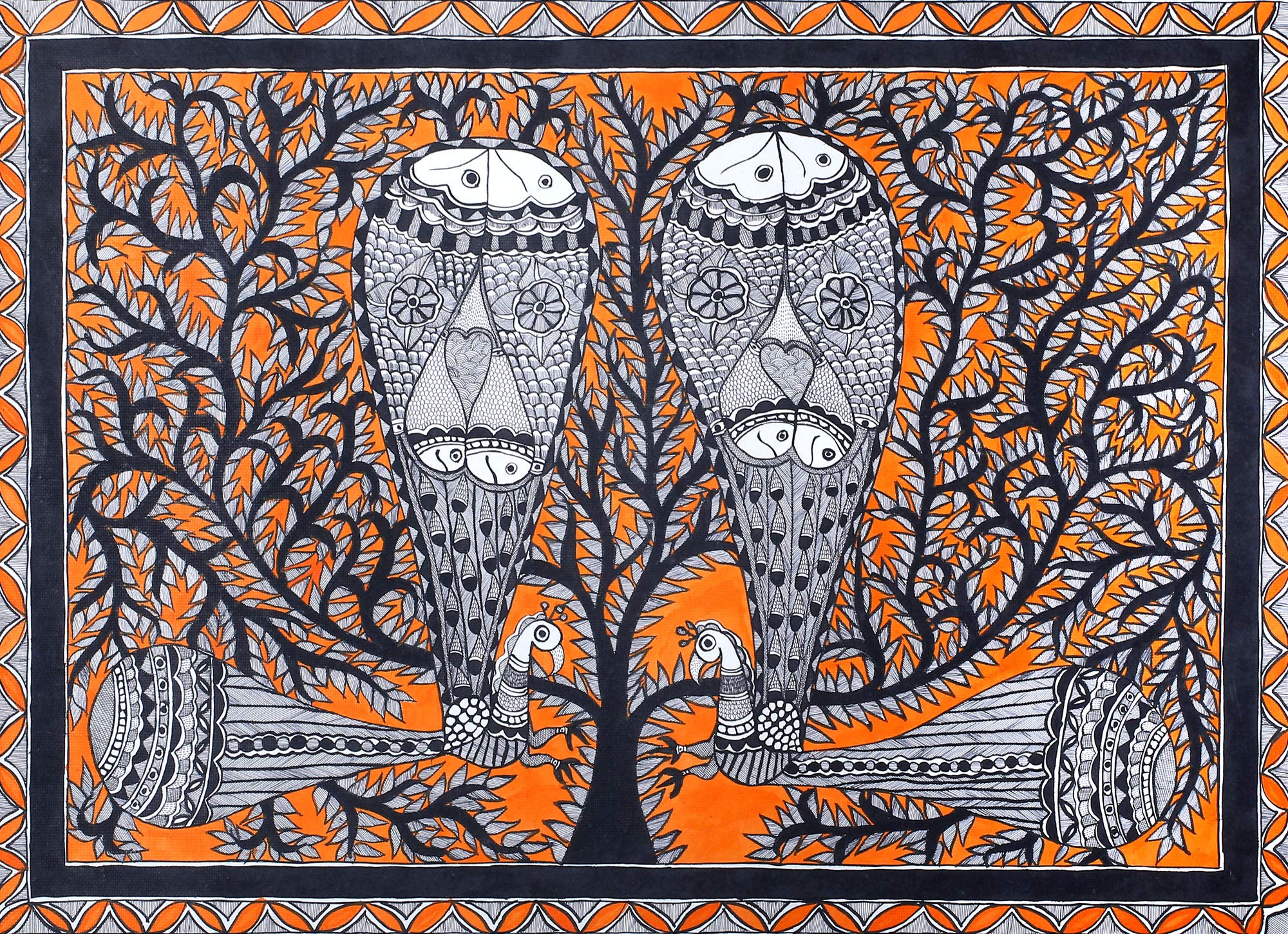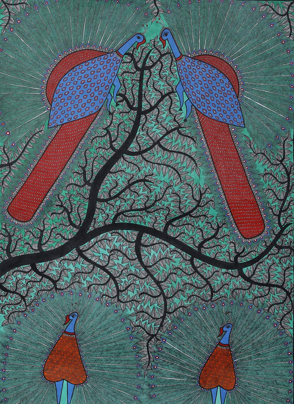 Exotic India Dancing Peacocks on Tree of Life - Madhubani Painting on Hand Made Paper - Folk Painting from The Vi