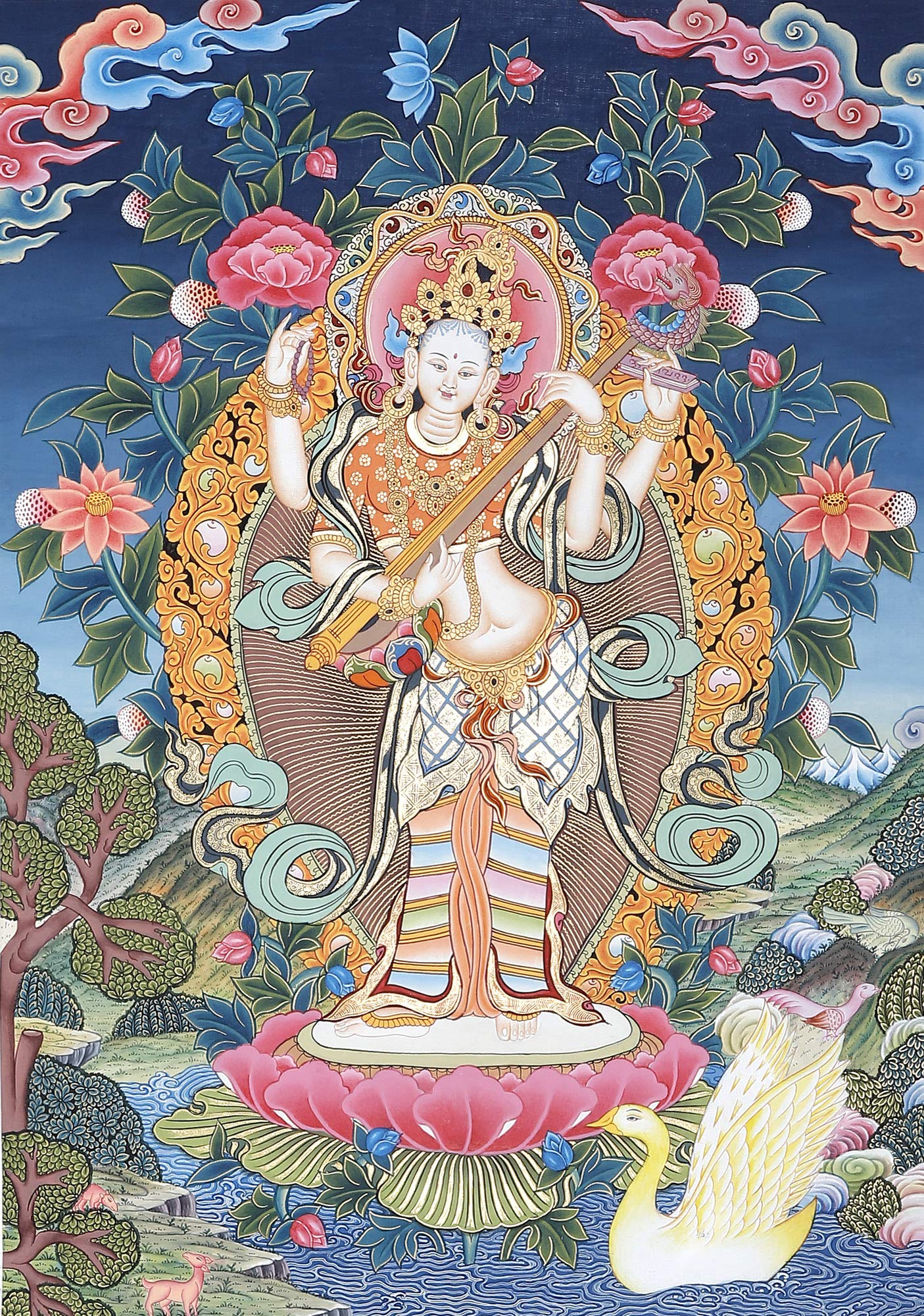 Exotic India Tibetan Buddhist Goddess White Tara -Goddess of Long Life (Thangka Without Brocade) - Tibetan Thangk