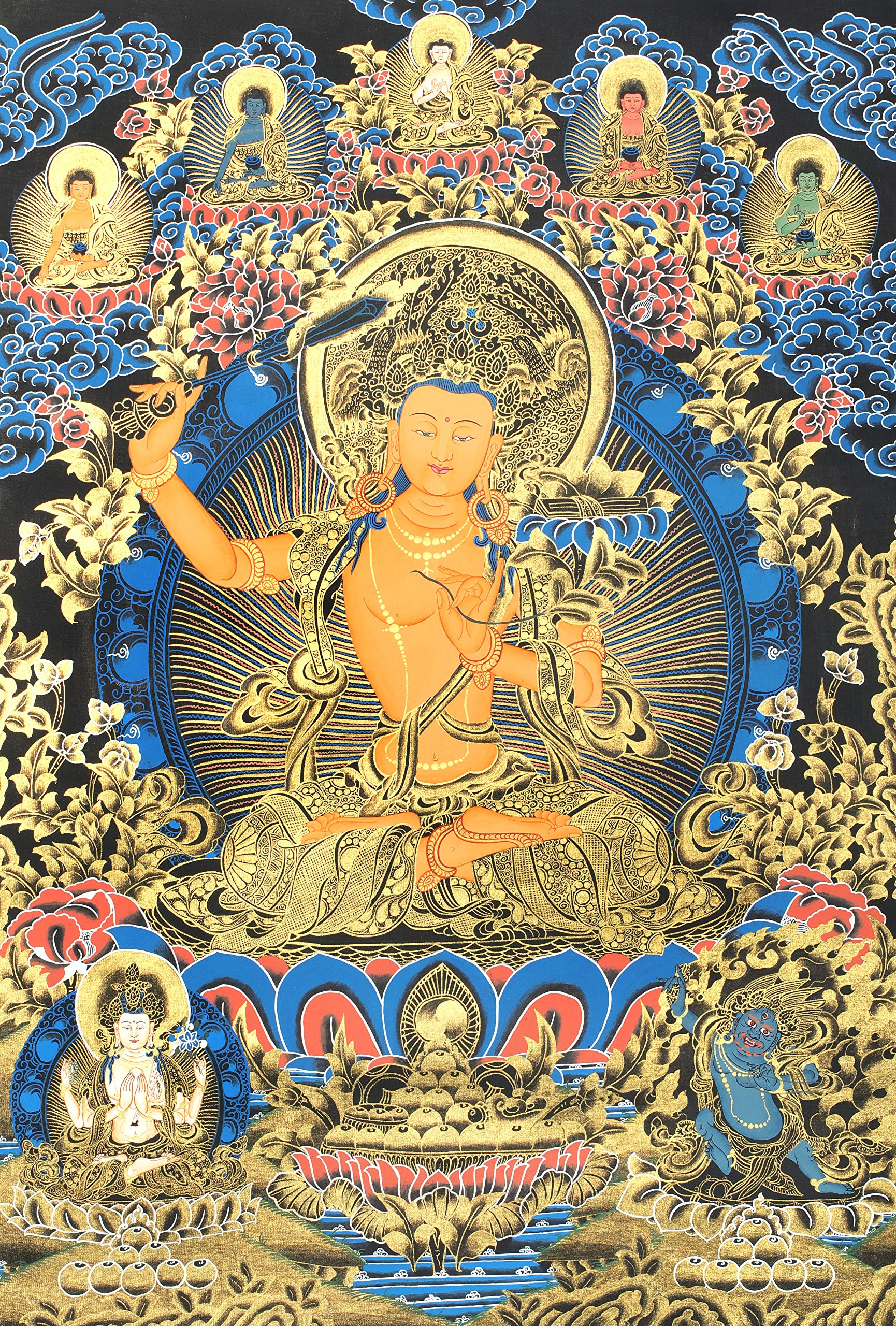 Exotic India Tibetan Buddhist Bodhisattva Manjushri with Five Dhyani Buddhas - Brocadeless Thangka - Tibetan Than