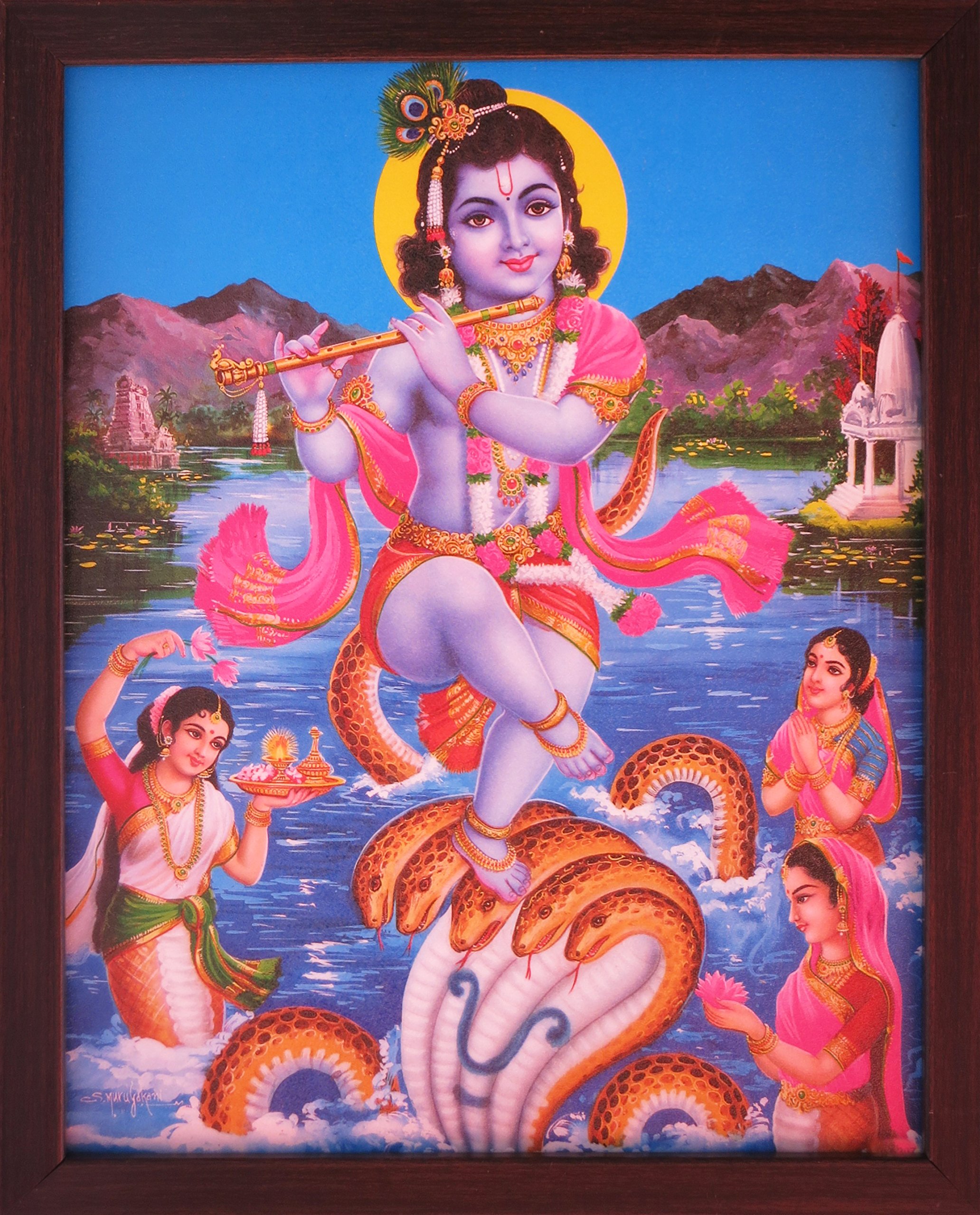 Handicraft Store Lord Krishna Dancing Over Snakes and Playing with Flute, a Religious & Elegant Poster with Frame with Frame, Must for Office/Home/Religious