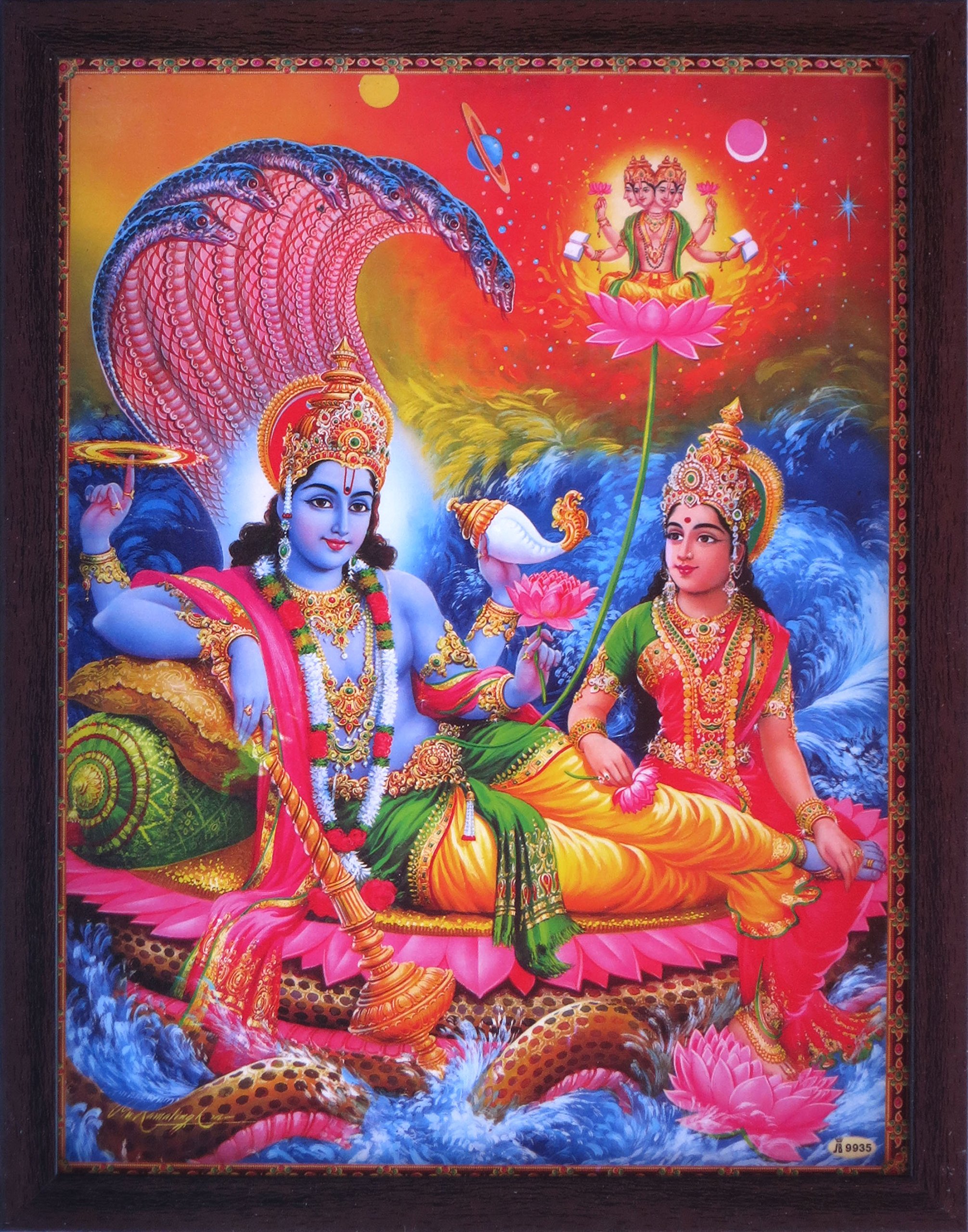 Handicraft Store Vishnu and Lakshmi Standing Under The Hood of Sheshnag, Poster Painting with framing, Must for Hindu Religious and Worship Purpose