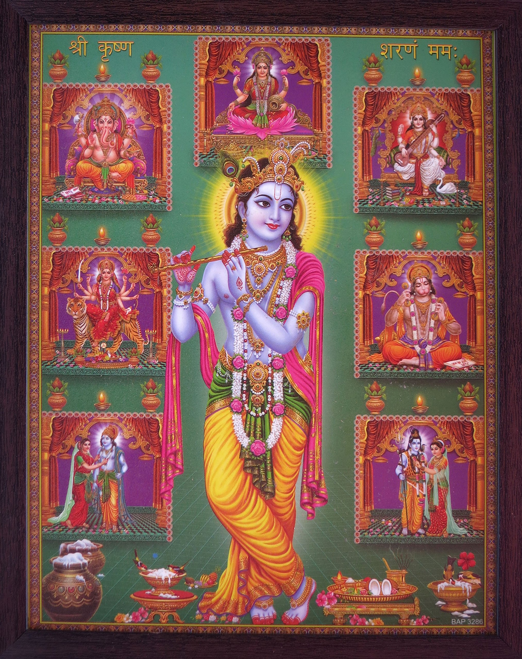 Lord Krishna Standing and Playing with Flute and Various God Are Showing Beside Their in a Picture, a Religious & Elegant Poster with Frame, Must for Office/Home/Religious