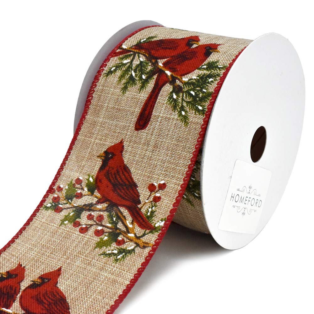Homeford Linen Cardinal Perch on Berries Wired Christmas Ribbon, 2-1/2-Inch, 10-Yard