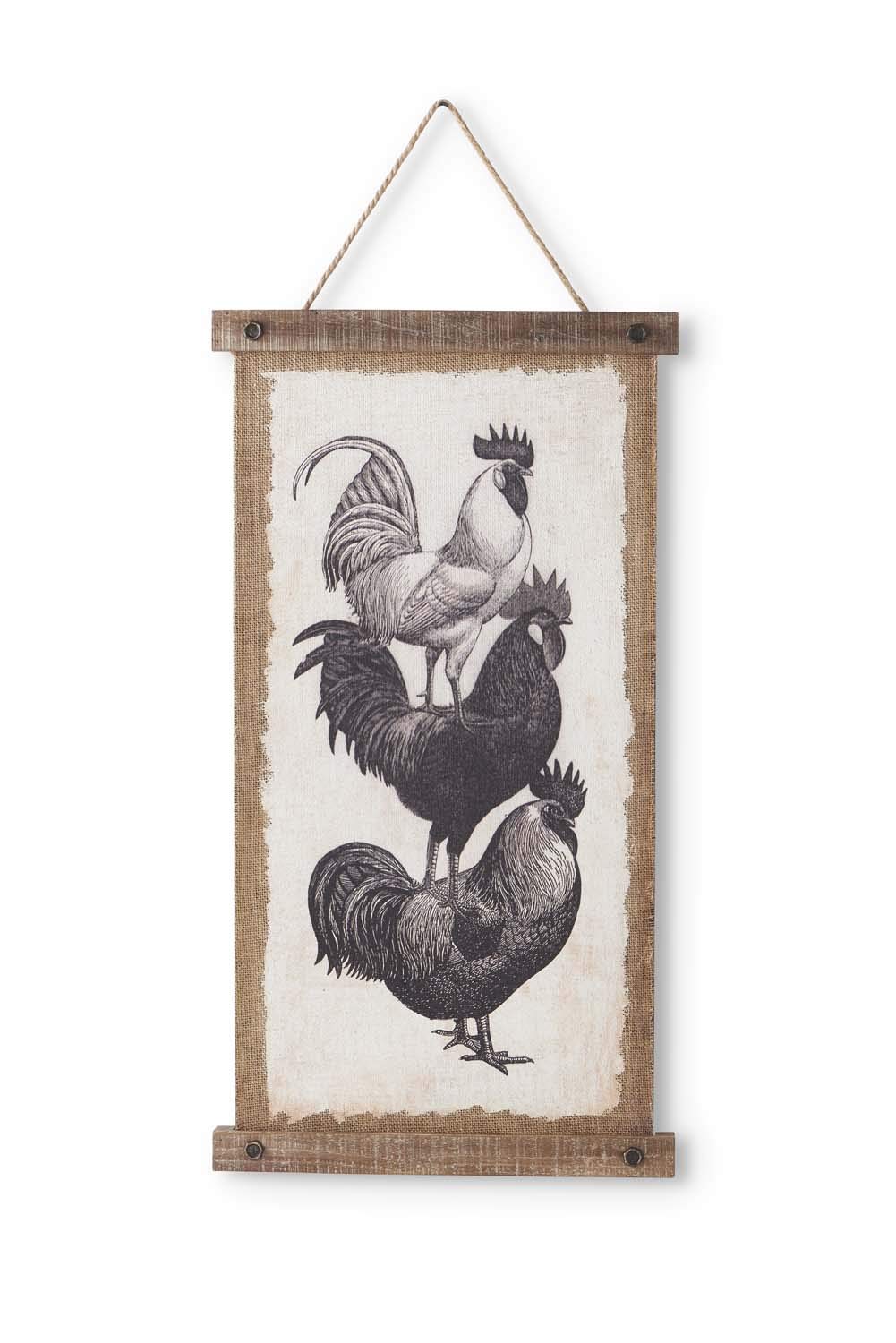 K&K Interiors 14326A Painted Rooster Print On Hanging Scroll, Iron/Wood-Fir/Burlap/Hemp Rope