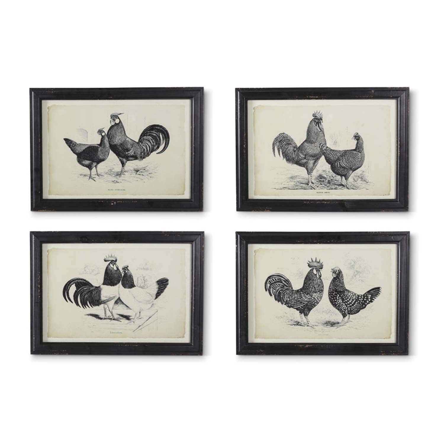 K&K Interiors 14977A 19.25 Inch Assorted White Vintage Rooster Prints in Black Frame, Wood-FIR+Glass