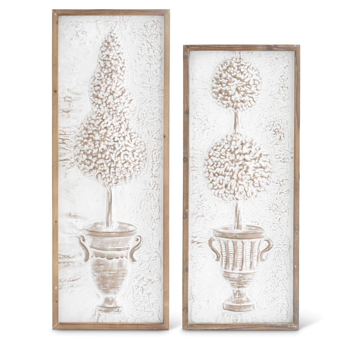 K&K Interiors 16237A Set of 2 Pressed Tin Whitewashed Topiary Wall Art in Wooden Frame
