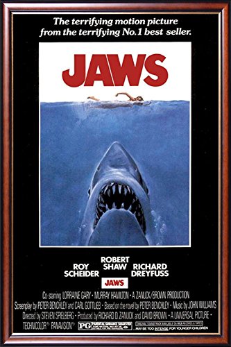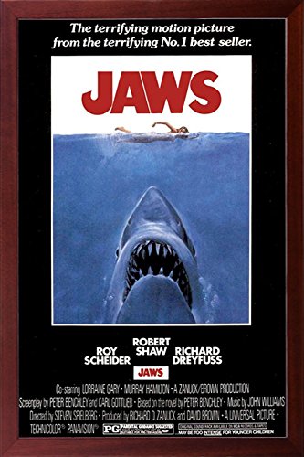 FRAMED Jaws 24x36 Poster Dry Mounted in Real Wood Walnut Brown Crafted in USA