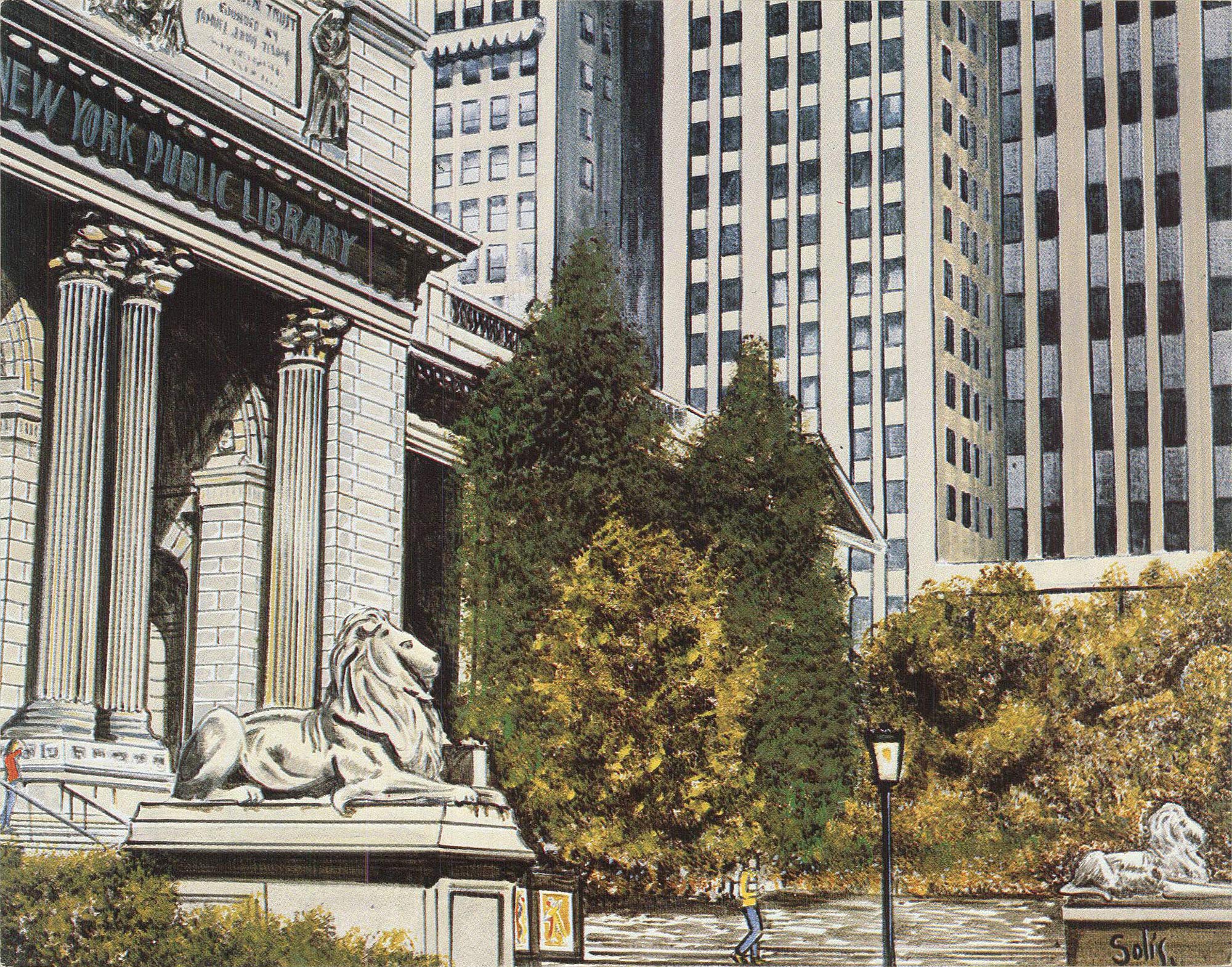 Solis New York Public Library 5.5" x 7" Offset Lithograph 1981 Contemporary Gray, Black & White, Green, Yellow