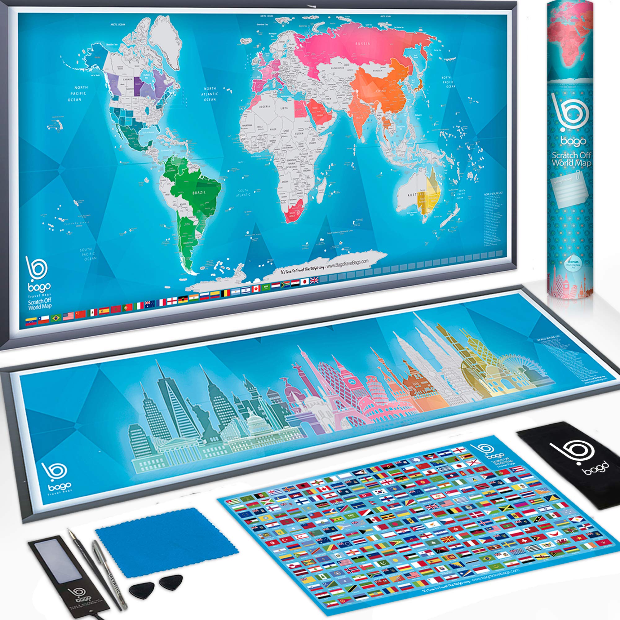 Scratch Off Map of The World + Skyline Art - World Map Poster Travel Gifts - 36x30” Panoramic Design Wall Decor Travel map with 32 Scratchable Iconic Buildings by Bago