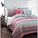 5-piece Queen Quilt Set for Girls Beautiful Coral Pink, Teal Blue, Violet, Colorful, Microfiber Bedding for Teens or Students, Fusion Starburst Stripe Across Pattern