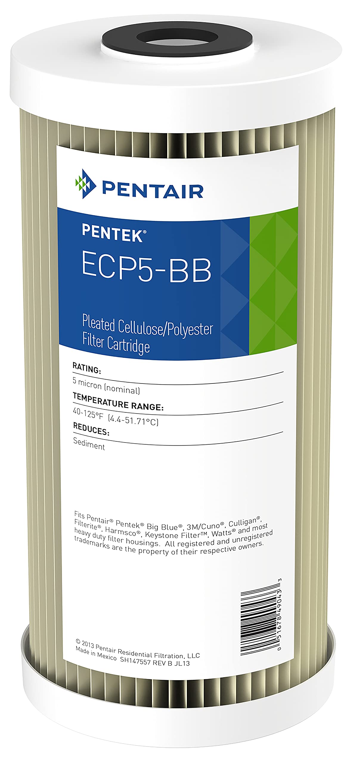 Pentek ECP5-BB 255490-43 Big Blue 10-Inch Sediment Water Filter, 4.5" x 10", Pleated Cellulose Polyester Cartridge, White End-Cap, 5 Micron
