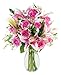 Bouquet of Pink Elegance: 12 Pink Roses, 5 Stargazer Lilies and Lush Greens with Vase - by KaBloom